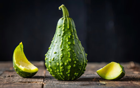 green calabash or Chinese Bottle Gourd is used by many cultures around the world for many different purposes, on a wooden table