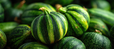 A variety of striped gourds stacked together in a lively marketplace showcasing their rich green hues and unique patterns inviting attention.