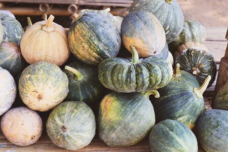 Group of beautiful decorative pumpkins of unusual shape, close-up on the market