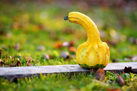 Decorative yellow pumpkin laying on the ground surrounded with autumn leaves on sunny autumn day