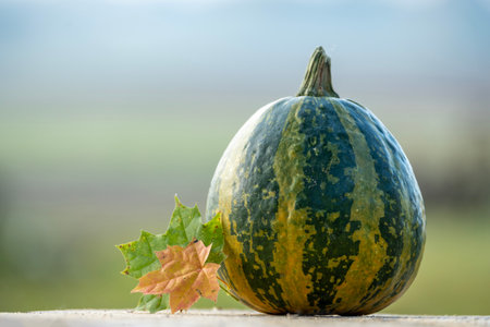 A close-up view of a colorful gourd with green and yellow stripes, accompanied by autumn leaves, set against a blurred natural background, evoking the season.