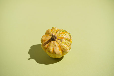 A small yellow pumpkin on a pastel green surface