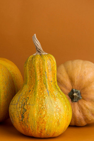 Squash on a yellow background. Autumn still life. Studio photography.