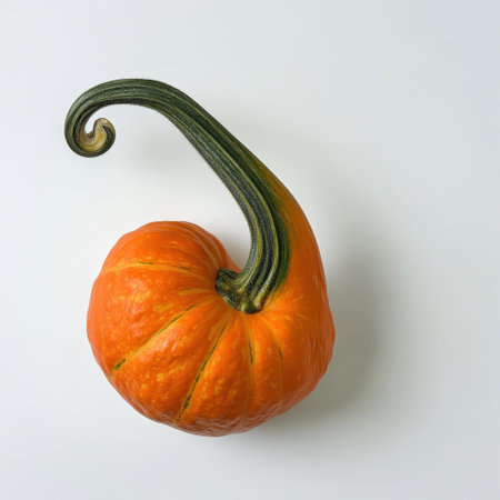 A bright orange pumpkin displays a twisted green stem, highlighting the beauty of fall produce. It sits against a simple background, emphasizing its vibrant colors and unique shape.
