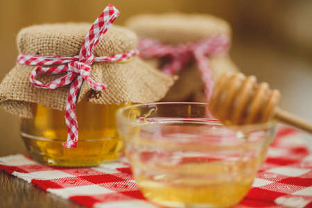 Honey dipper in a jar, on an old vintage wood background - close up. Countryside breakfast concept.