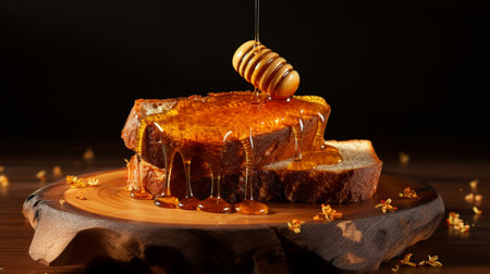 Honey dripping from a honey dipper on a slice of bread. Generate Ai