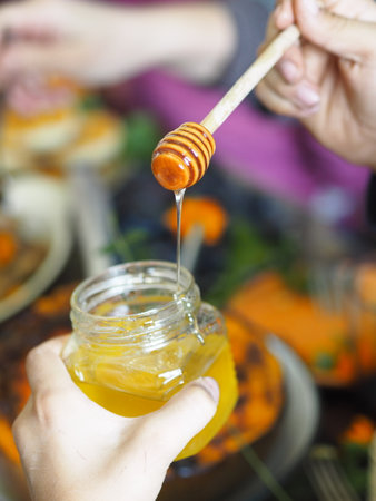 Thanksgiving Day. Liquid natural honey flowing from a skewer against the background of a served table.Healthy food.