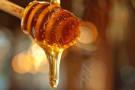 Close-up image of honey dripping from a spoon, showcasing its golden color and smooth texture. Perfect for food, wellness, and culinary themes.