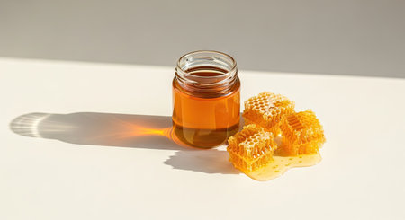 Close-up of a jar of golden honey with honeycombs placed nearby, photographed in high quality to emphasize texture and purity in a clean, light setting.