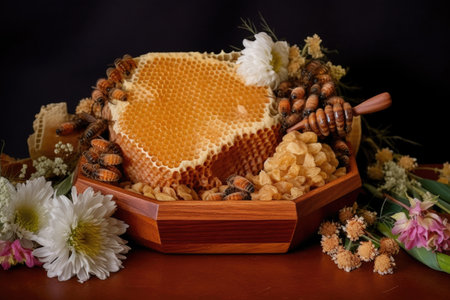 honeycomb pieces in wooden bowl surrounded by flowers, created with generative ai