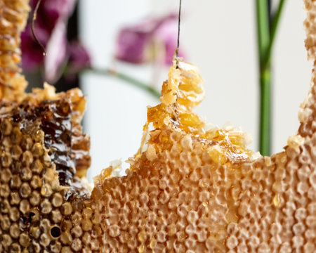 Close-up honeycomb with fresh honey drip.