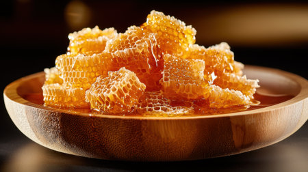 A bowl of honeycomb is sitting on a table. The honeycomb is made of wax and has a golden color. The honeycomb is arranged in a way that it looks like a pile of honey. The bowl is wooden