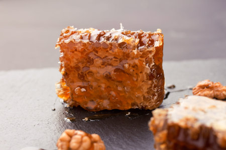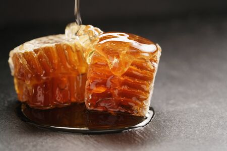 natural honey pour over honeycomb on slate board, with copy space
