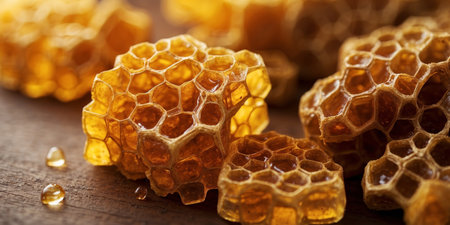 Organic honeycomb pieces stacked on a wooden surface with a soft background glow. Generative AI