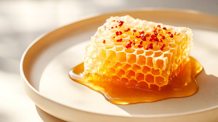 Golden honeycomb drizzled with spicy hot honey and sprinkled with chili flakes, served on minimalist plate in warm sunlight. Concept of gourmet flavors, natural sweetness, and culinary creativity