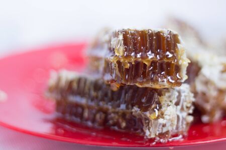 Honeycomb on red background. Close up view of honeycombs.
