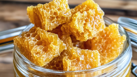 A stunning display of golden honeycomb blocks in a glass jar with a wooden spoon, perfect for anyone who appreciates natural sweetness and organic ingredients for their dishes.