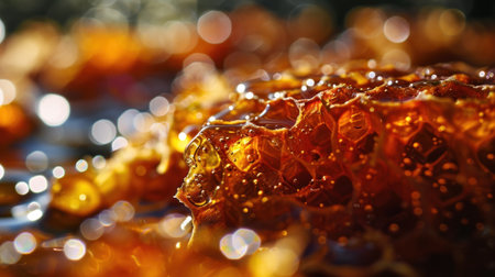 A vibrant close-up of honeycomb dripping with golden honey, showcasing rich textures and sparkling droplets against a warm background, perfect for culinary themes.