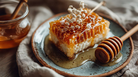 A vibrant slice of fresh honeycomb served on a rustic plate, accompanied by a wooden dipper and a honey jar, perfect for culinary delights.