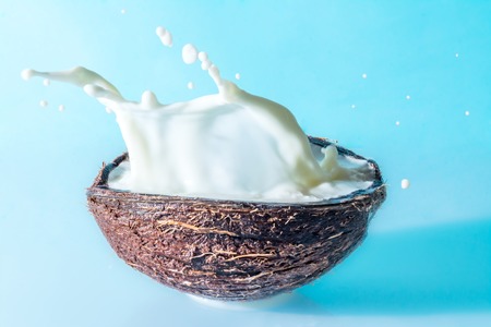 Coconut with milk splash on a blue background, splashing milk in coconut