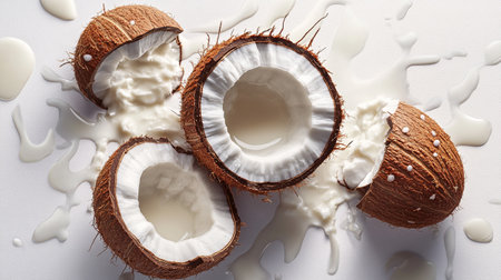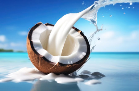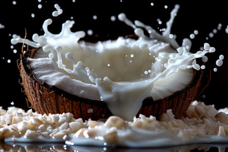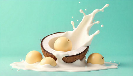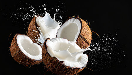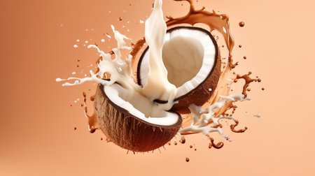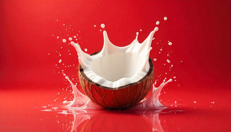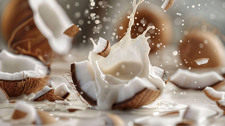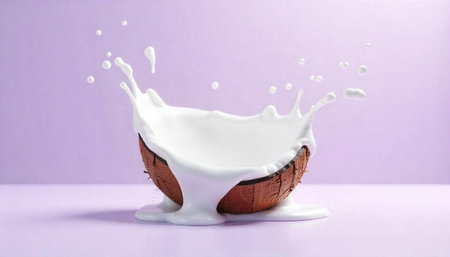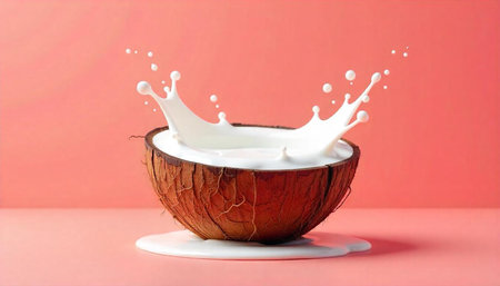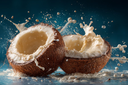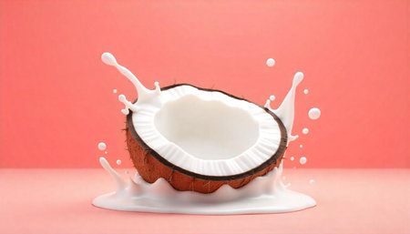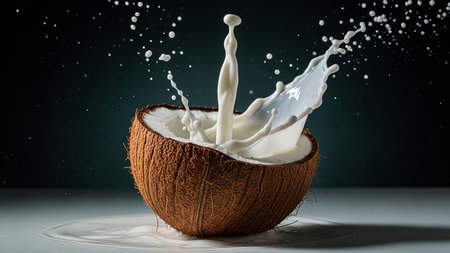 A dynamic splash of white coconut milk erupts from a halved coconut shell. Clear details and vibrant colors en...