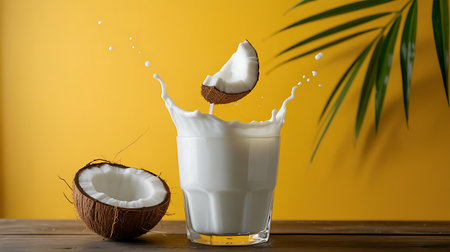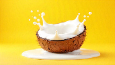 Coconut milk splash on a vibrant yellow background image