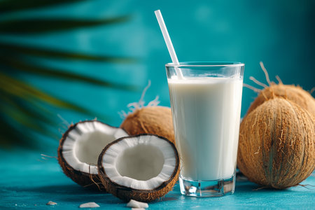 A glass filled with creamy coconut milk is placed beside halved coconuts and coconut chunks. The backdrop is a vivid blue, enhancing the tropical feel of the setting.