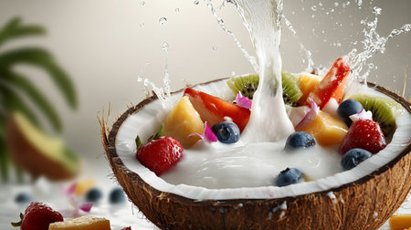 A vibrant splash of coconut milk pouring over a bowl of exotic fruits, capturing the essence of tropical freshness and indulgence in every droplet.