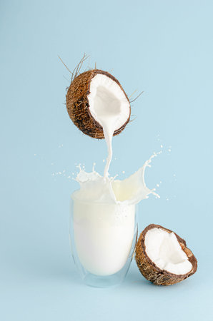 Pouring milk from a coconut and splash in a glass on pastel blue background. Food levitation concept. Vertical
