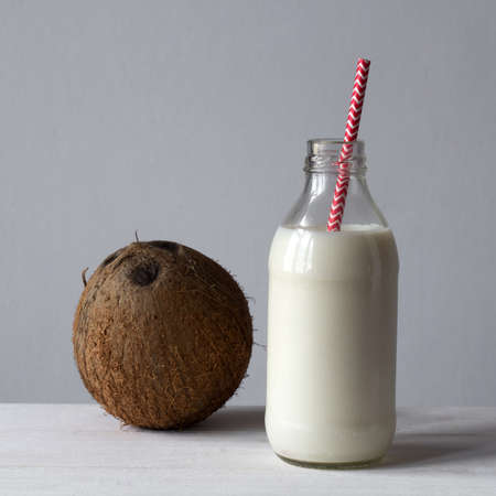 fresh organic vegan coconut milk in a bottle with cocktail straw, square