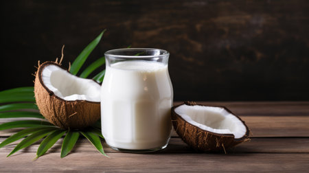 Beautiful close-up of healthy coconut milk on a table, made with generative AI