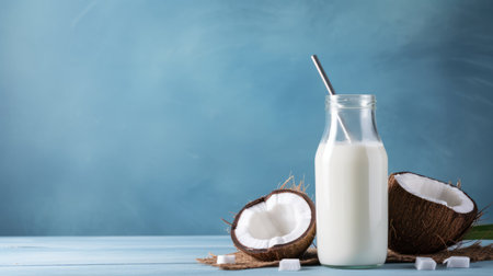 Alternative coconut milk background with jar of milk, coconut and place for text. Plant based eco organic healthy product concept