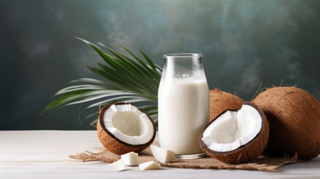 A refreshing still life featuring whole coconuts, a halved coconut, and a pitcher of creamy coconut milk, accented with palm leaves.