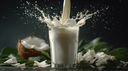 A stream of milk cascades into a glass, creating a dynamic splash effect. The scene includes a cracked coconut, fragments of coconut, and green leaves, set against a dark background. The composition features high-speed photography, suitable for advertising, or editorial content related to beverages or healthy eating.