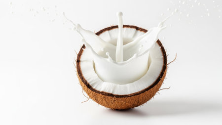 A dynamic splash of creamy white coconut milk erupts from a ripe, halved coconut against a clean white backdrop, highlighting its tropical essence