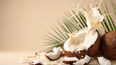 Elegant advertising template with a splash of coconut milk and coconut pieces on one corner, with plenty of space for copy on a light beige background, --ar 16:9 Job ID: b3dc480b-dfa3-40a4-9a58-0e4c473c46f1