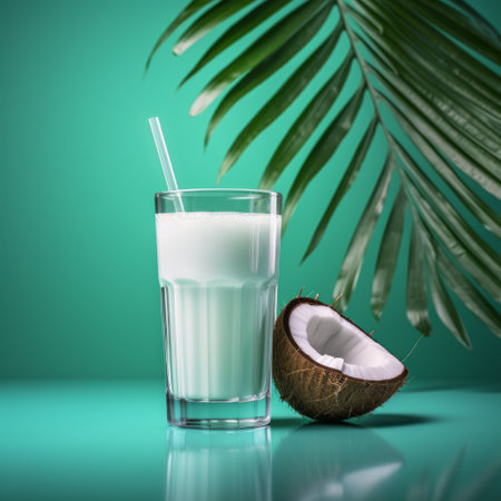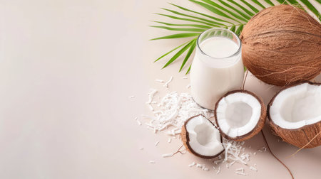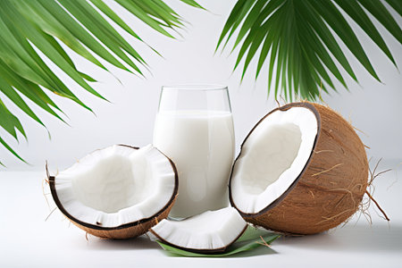 This captivating stock photo features fresh coconut milk in a glass alongside halved coconuts and coconut shavings, enhanced by green palm leaves. Perfect for culinary and health-related projects.
