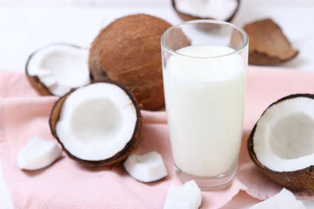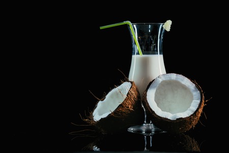 Fresh coconut and coconut milk. Coconut milk in a glass. Alternative milk concept for people with lactose intolerance.