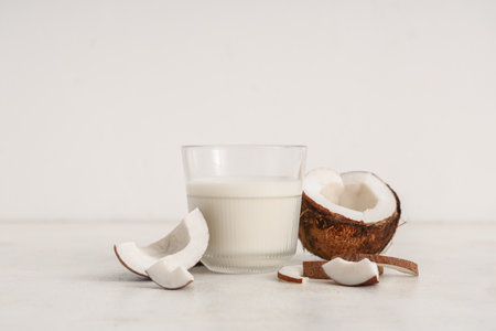 Fresh coconut milk and milk in a glass on a wooden table, with a whole coconut and spoonfuls of coconut milk scattered around