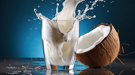 Experience tropical bliss with this dynamic image capturing a coconut split open with milk splashing against a serene blue backdrop. Perfect for vibrant designs. Generated A.I.