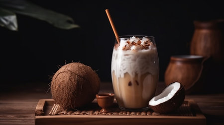 Fresh coconut milk with coconut .Health food, diet concept.Created with Generative AI technology.