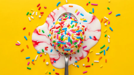 Vanilla ice cream with rainbow sprinkles on a spoon, against a bright yellow background with scattered sprinkles.