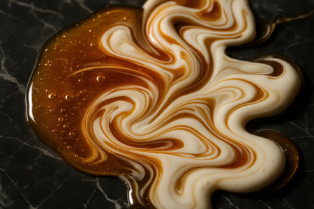 Viscous, glossy honey and creamy milk swirling together on a dark marble surface, creating an abstract, artistic pattern.