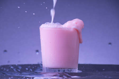 Pouring strawberry milk into a transparent mug with water splash