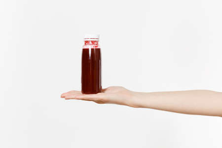 Close up female holds in hand on palm dark red detox smoothies in bottle isolated on white background.