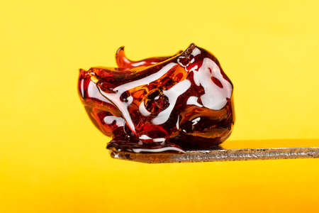 large piece of cannabis wax on a yellow background close-up, resin dab on scrape stick