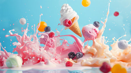 A vibrant splash of pink ice cream and fresh frozen fruits mid-motion, creating a dynamic and colorful dessert-themed composition.