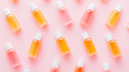 Trendy pink and orange shampoo bottles arranged in a stylish composition, perfect for modern beauty branding.