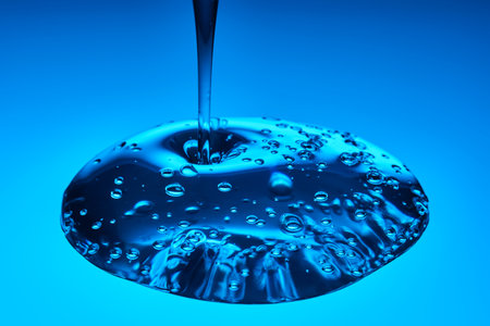 liquid moisturizing shampoo dripping down on blue background close-up.