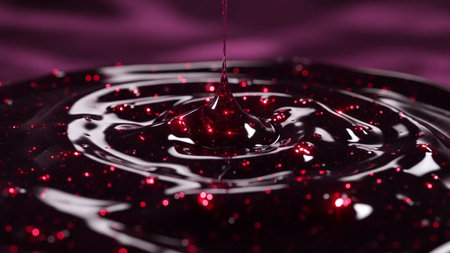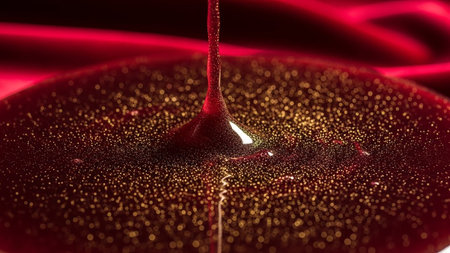A macro shot captures the interaction of golden glitter within a thick, dark red liquid. A single drop of the liquid is captured mid-drip, creating a smooth, glossy texture. The glitter is evenly distributed, creating a sparkling, textured surface. The background is a blurred, rich red fabric, emphasizing the deep, tones of the liquid and the metallic sheen of the glitter.